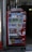 A bright red vending machine displaying various drinks including bottled water, teas, and sodas. The machine has advertisements for free Wi-Fi and gaming, along with several signs and labels in multiple languages. It is situated in an urban area, with a sidewalk partially visible beside it.